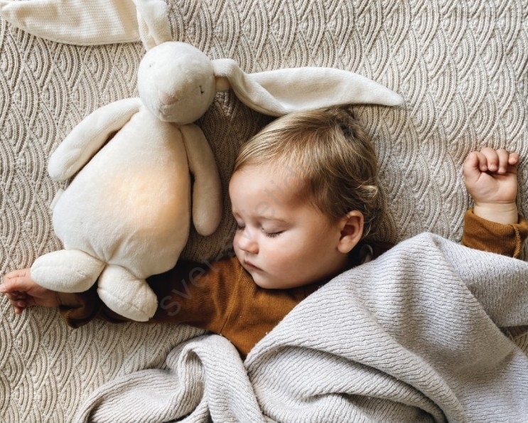 • Moonie usínáčik v podobe roztomilého zajka s nočným svetlom a relaxačnými zvukmi pomáha bábätku ľahšie zaspať.