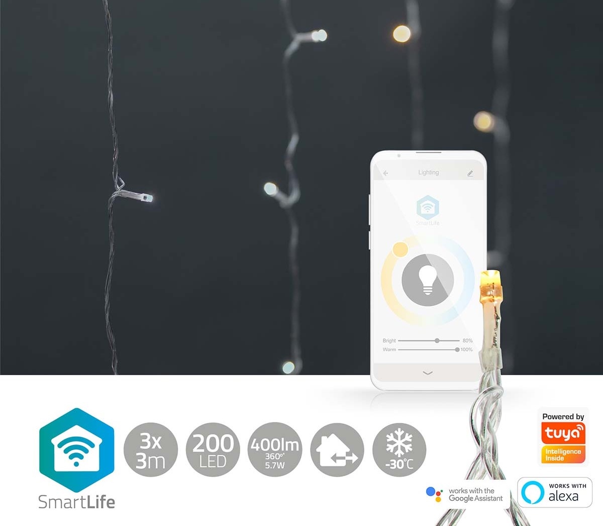 LED vianočný záves 200 LED / 11 funkcií, 6 m, IP65, Wi‑Fi Tuya, teplá až studená biela