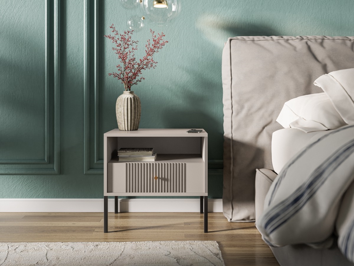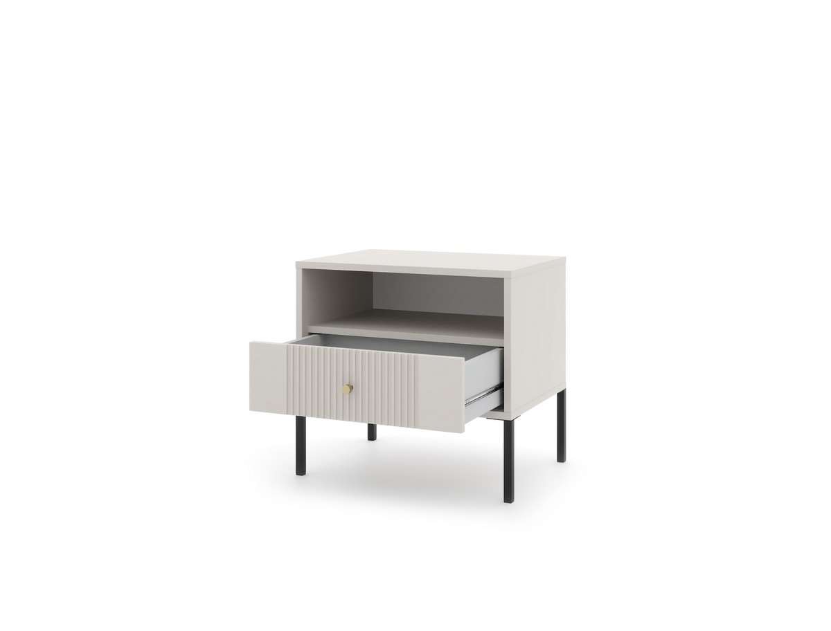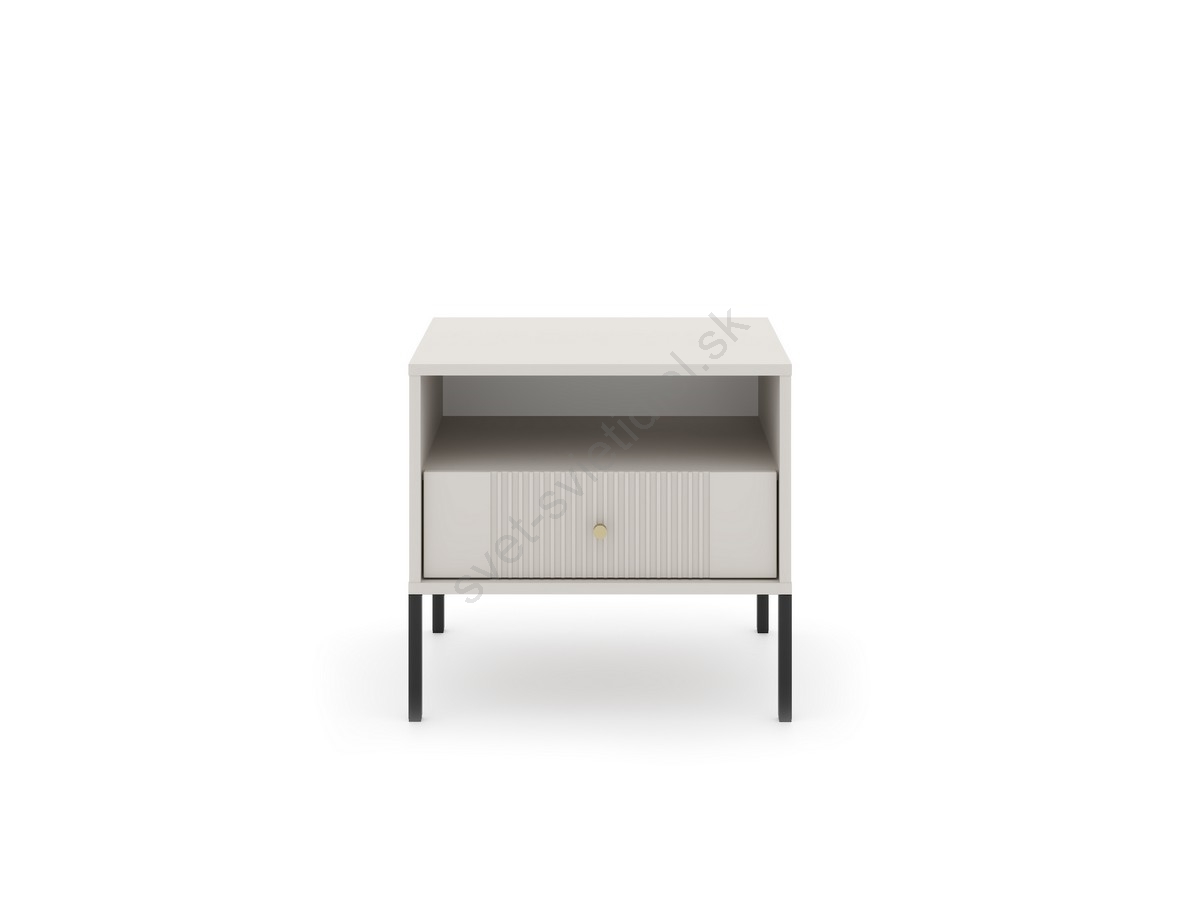• Má jednu otvorenú poličku a jednu zásuvku zdobenú vertikálnym ryhovaním pre rafinovaný vizuálny efekt.