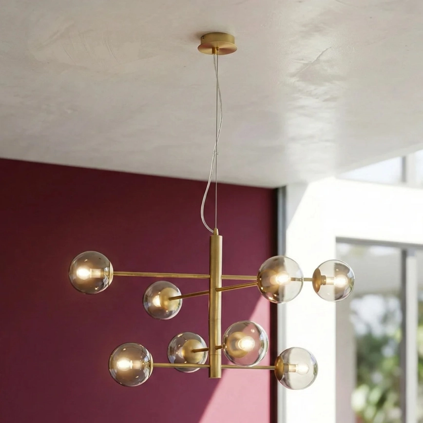 Ondaluce - Závesný luster ELISEO na lanku 8xE14/10W/230V pr. 97 cm zlatý/dymovo béžový charakterizuje pekný dizajn a funkčné prevedenie.  Do svietidla je určená žiarovka s päticou E14. Tu si môžete kúpiť ďalšie žiarovky za výhodnú cenu. Získate tak zaujímavý doplnok do svojho domova.