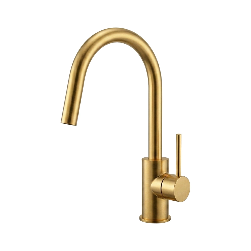 • Elegantná umývadlová stojanková batéria v teplom zlatom tóne.