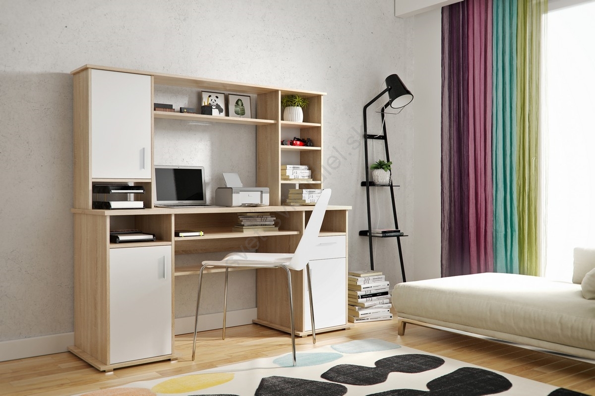 • Ponúka priestrannú pracovnú dosku, vysúvaciu priehradku na klávesnicu a viacero úložných priestorov, vrátane uzavretých skríň, otvorených políc a vertikálnych priehradok.