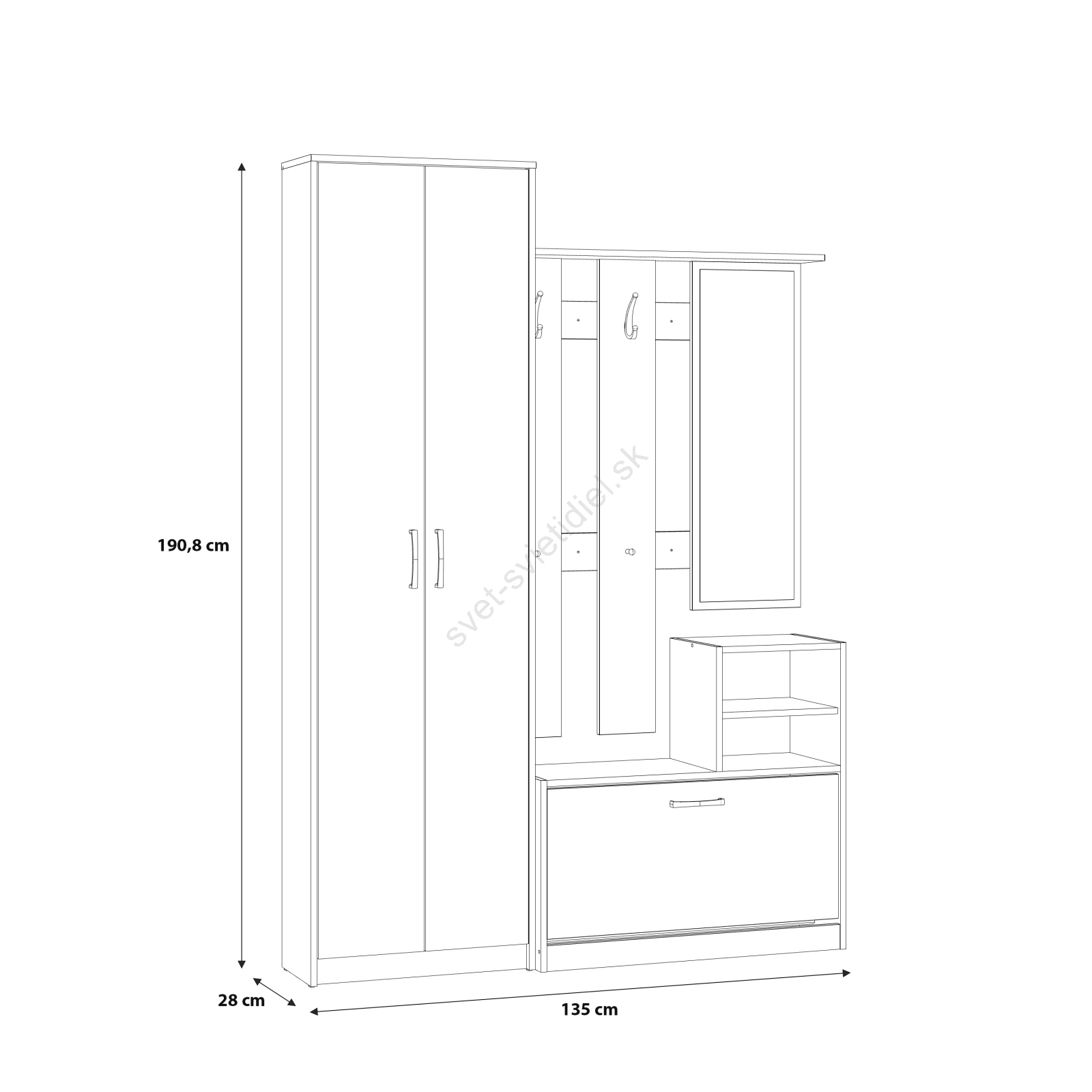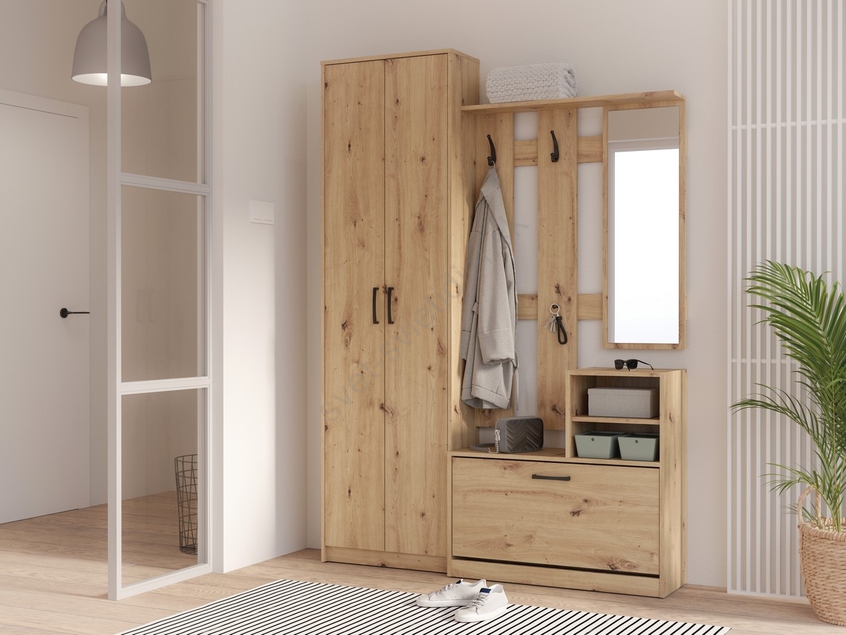• Skriňa, police, botník, háčiky a veľké zrkadlo ponúkajú presne to, čo potrebujete.