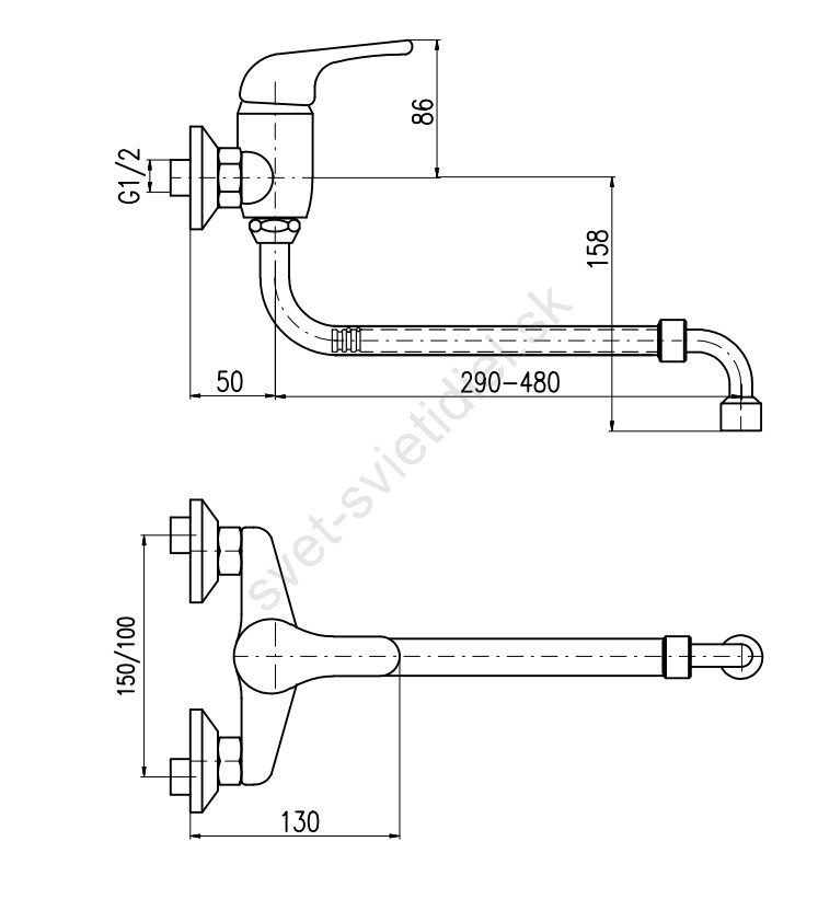 • Nástenná drezová batéria s guľatým teleskopickým ramienkom