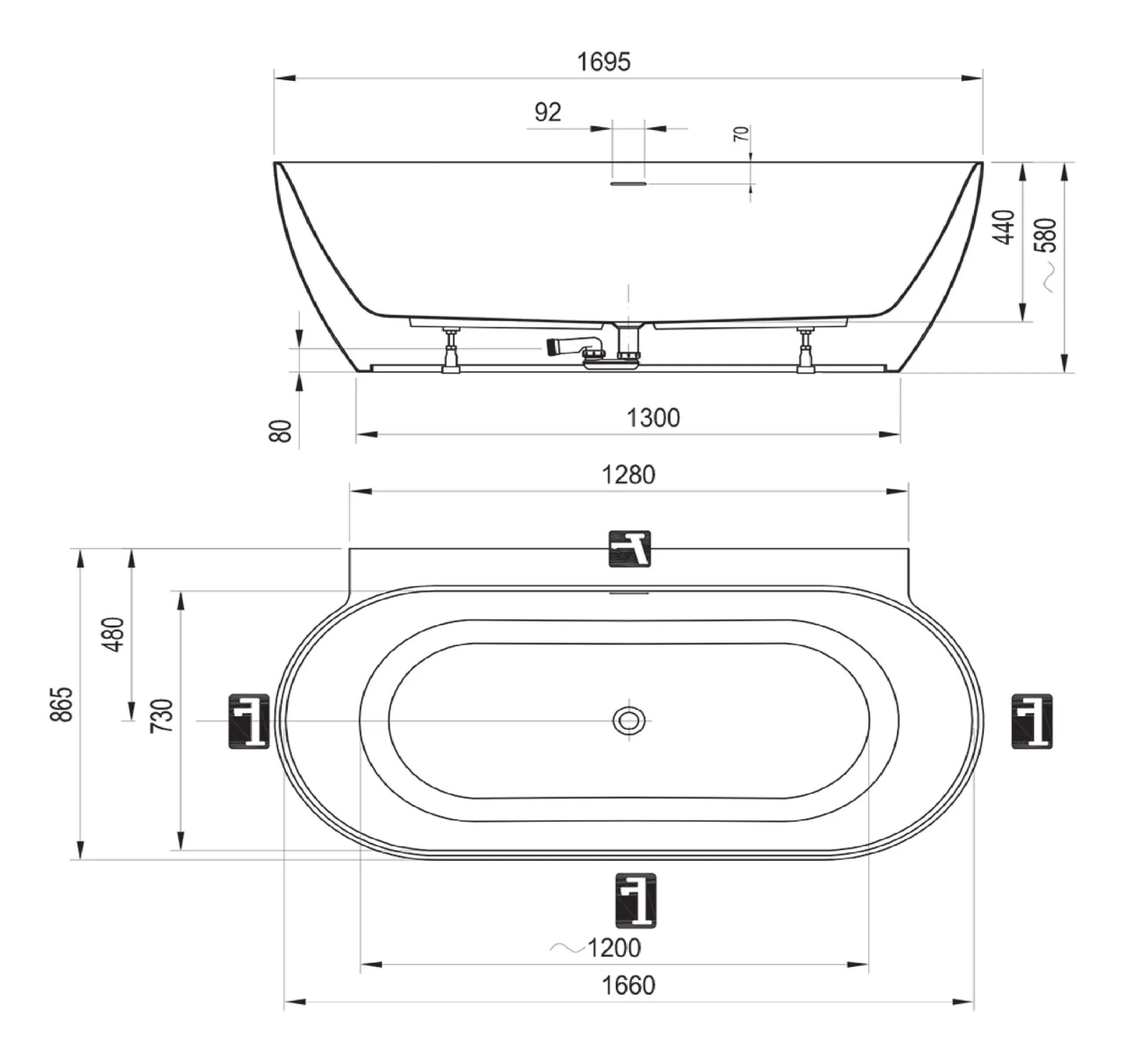 • Vaniový odtokový komplet (t. j. prepad, pileta, sifón, zápachová uzávera) a podpera (nožičky) sú súčasťou balenia.