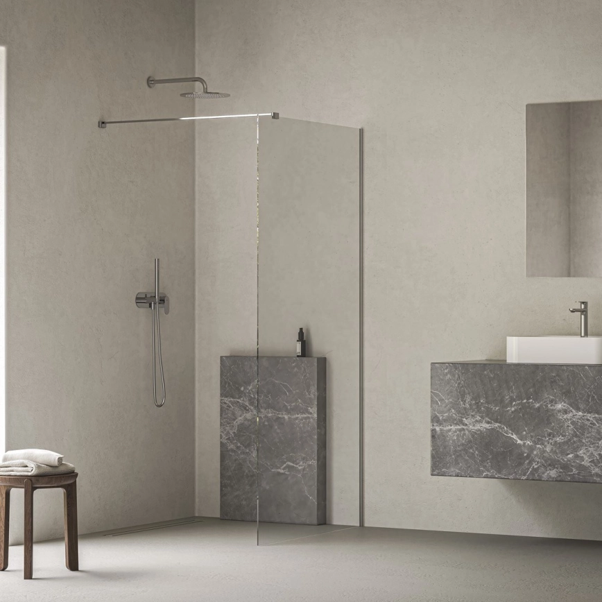 • Sprchový kút Walk-In Wall v chrómovom prevedení ponúka moderný a otvorený vstup, ktorý je možné prispôsobiť podľa potreby až do šírky 120 cm.