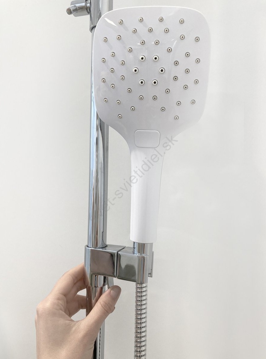 • Sprchový stĺp Termo je posuvná súprava s termostatickou batériou v lesklom chrómovom prevedení a s bielou hlavovou sprchou.