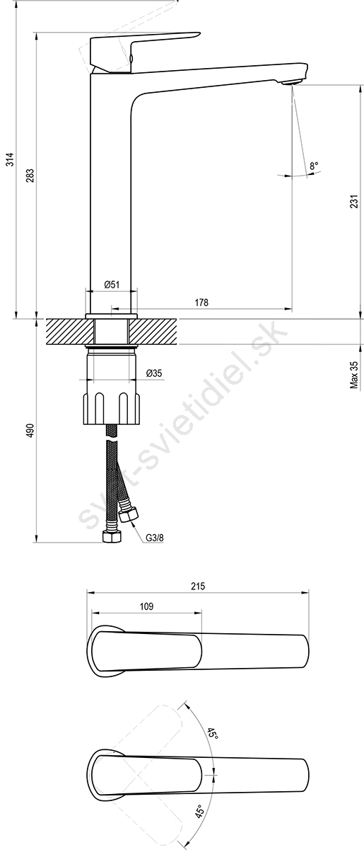 • Batéria sa dodáva bez výpuste a obsahuje flexibilné pripojovacie hadičky dĺžky 450 mm s priemerom G3/8.