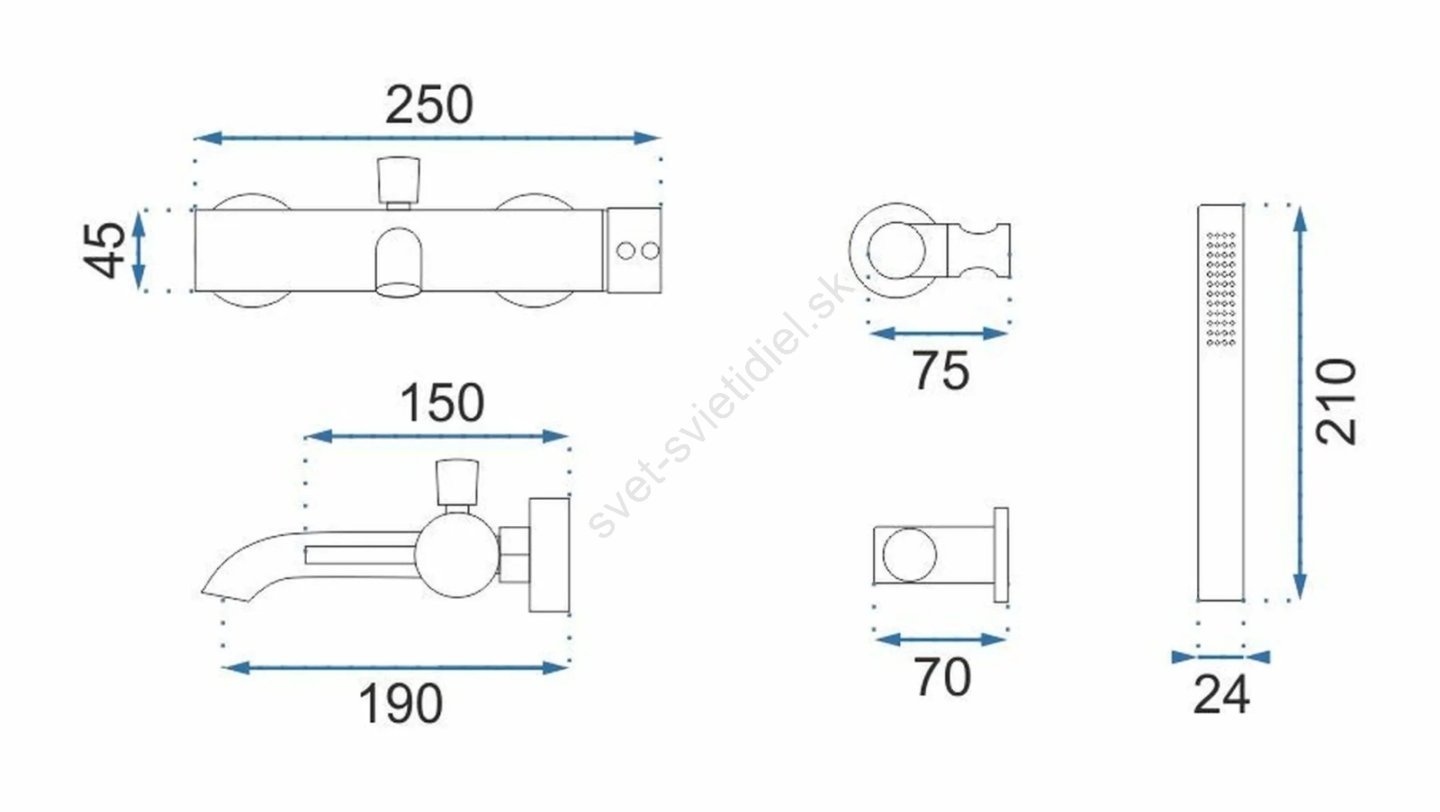 • Sada obsahuje: vaňovú batériu, ručnú sprchu, sprchovú hadicu (190 mm), držiak ručnej sprchy.