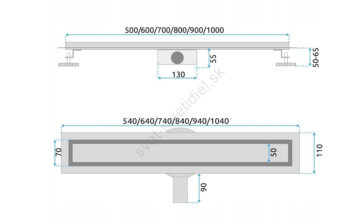 • Vďaka výškovo nastaviteľným nožičkám (50–65 mm) sa odtok ľahko prispôsobí rôznym podlahovým podmienkam.