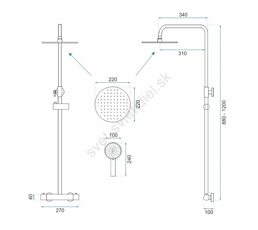• Balenie obsahuje: termostatickú batériu, ručnú a hlavovú sprchu, držiak, 150 cm hadicu.