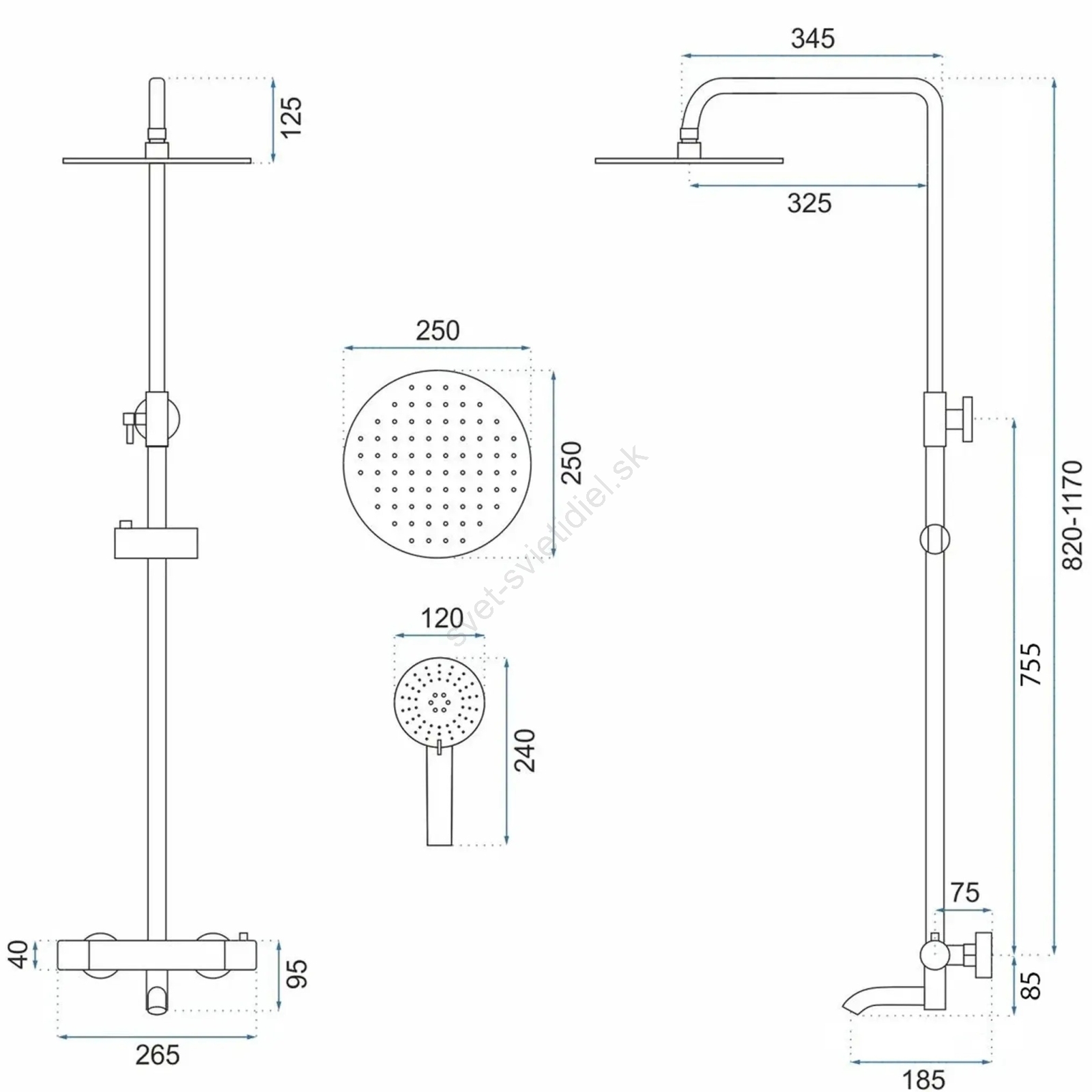 • Nastavenie výšky sprchovej tyče: 82 - 117 cm.