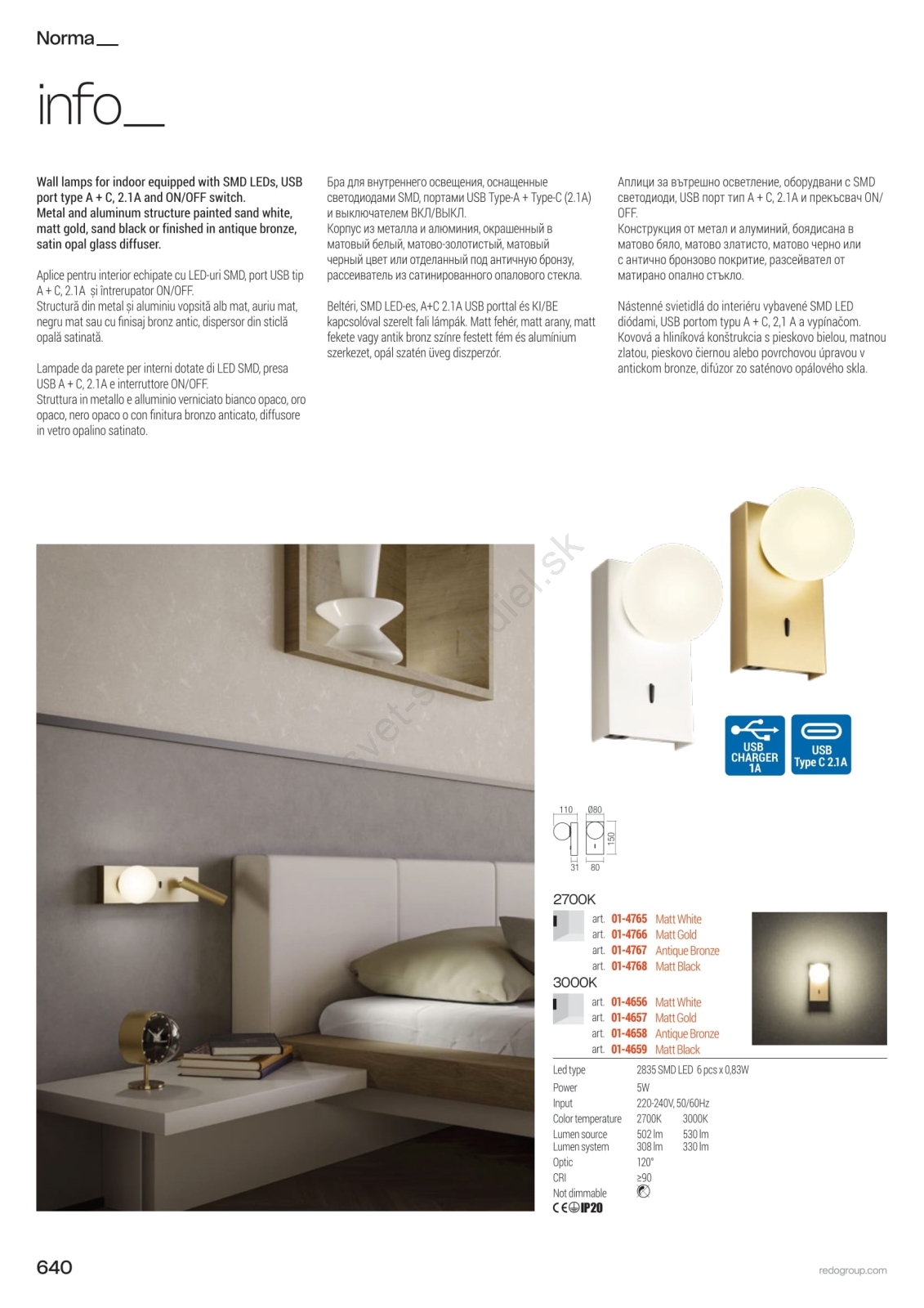 • Redo 01-4656 - LED nástenné svietidlo NORMA LED/5W/230V CRI 90 USB biela