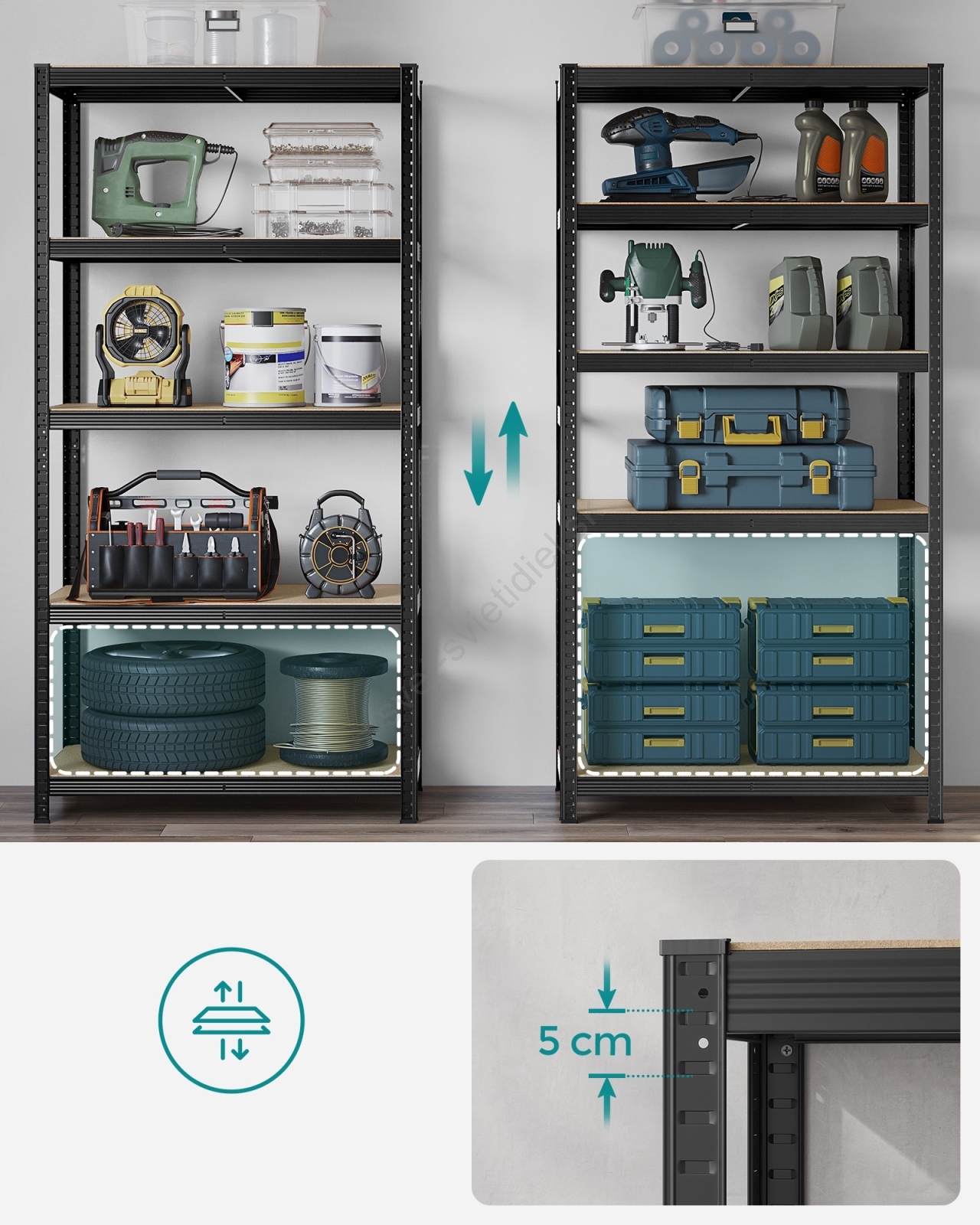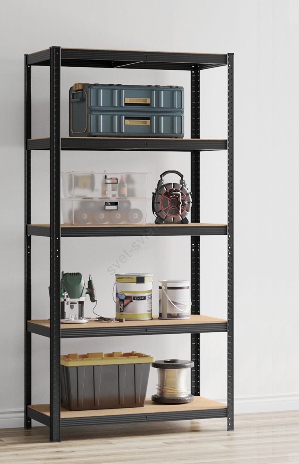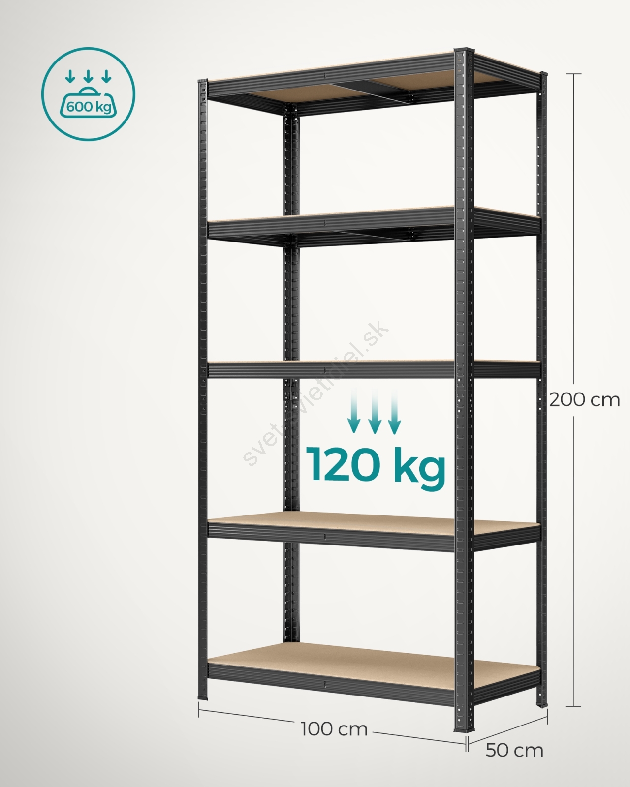 • Každá polica unesie až 120 kg a bezpečne udrží farby, náradie a fitness vybavenie.
