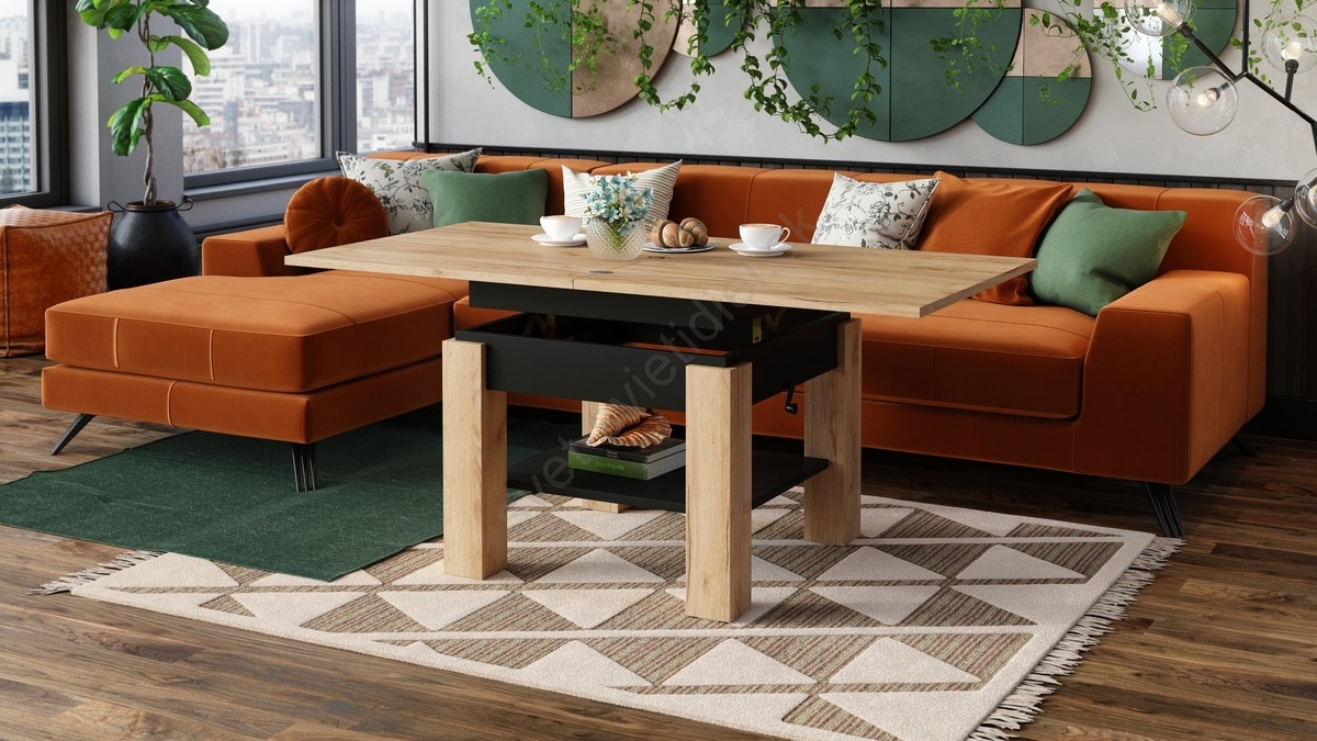 Rozkladací konferenčný/jedálenský stôl s zdvíhacou doskou CALEB dub craft/čierna