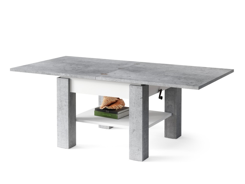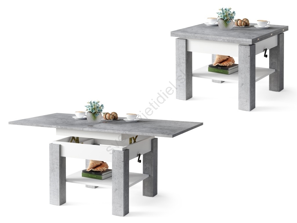Rozkladací konferenčný/jedálenský stôl so zdvíhacou doskou CALEB sivý betón/biela