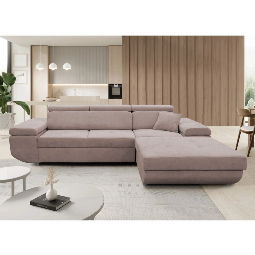 Rozkladacia rohová sedacia súprava s úložným priestorom do tvaru L CASTELO pravá béžová