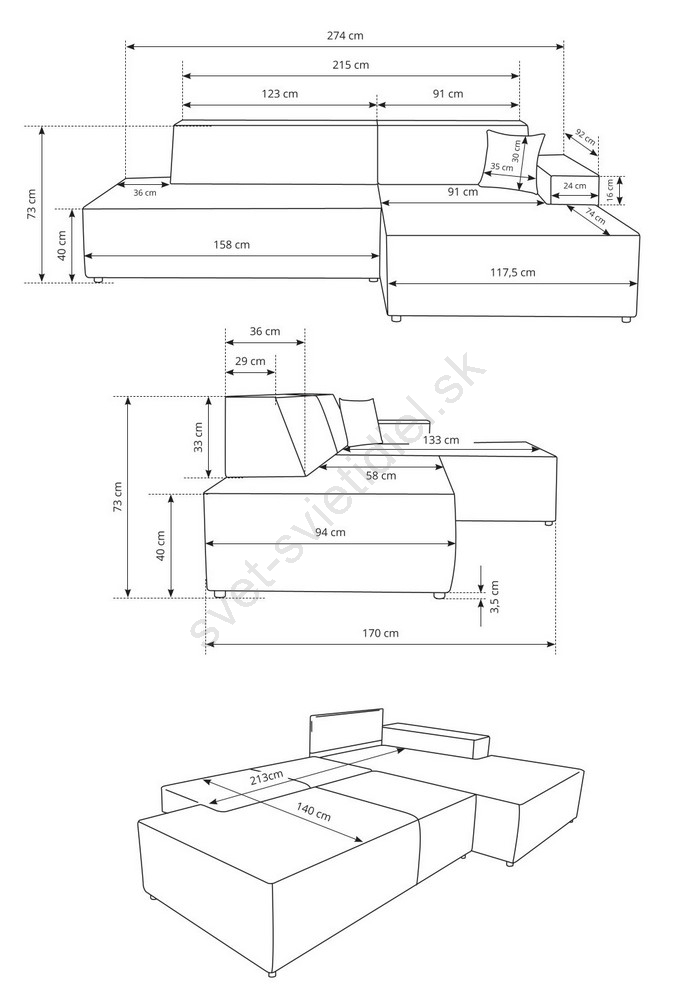 • Elegantné nohy (výška 3,5 cm) dodávajú sedačke moderný vzhľad a zároveň zaisťujú stabilitu a dlhú životnosť.