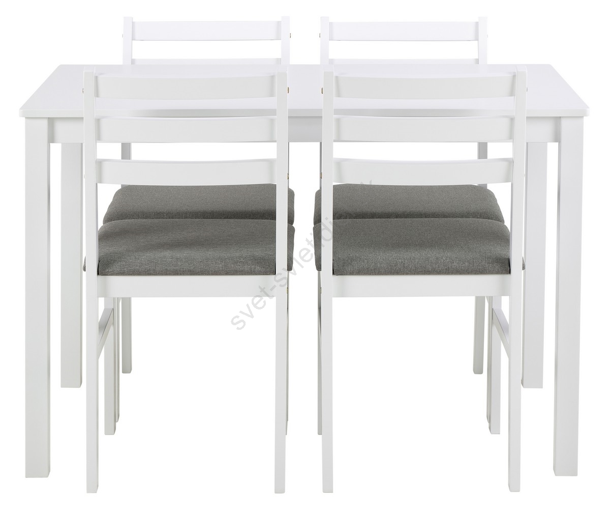 • Skladá sa z obdĺžnikového jedálenského stola a 4 zodpovedajúcich stoličiek s čalúnenými svetlosivými sedákmi, všetko vyrobené z masívneho dreva v bielom prevedení.