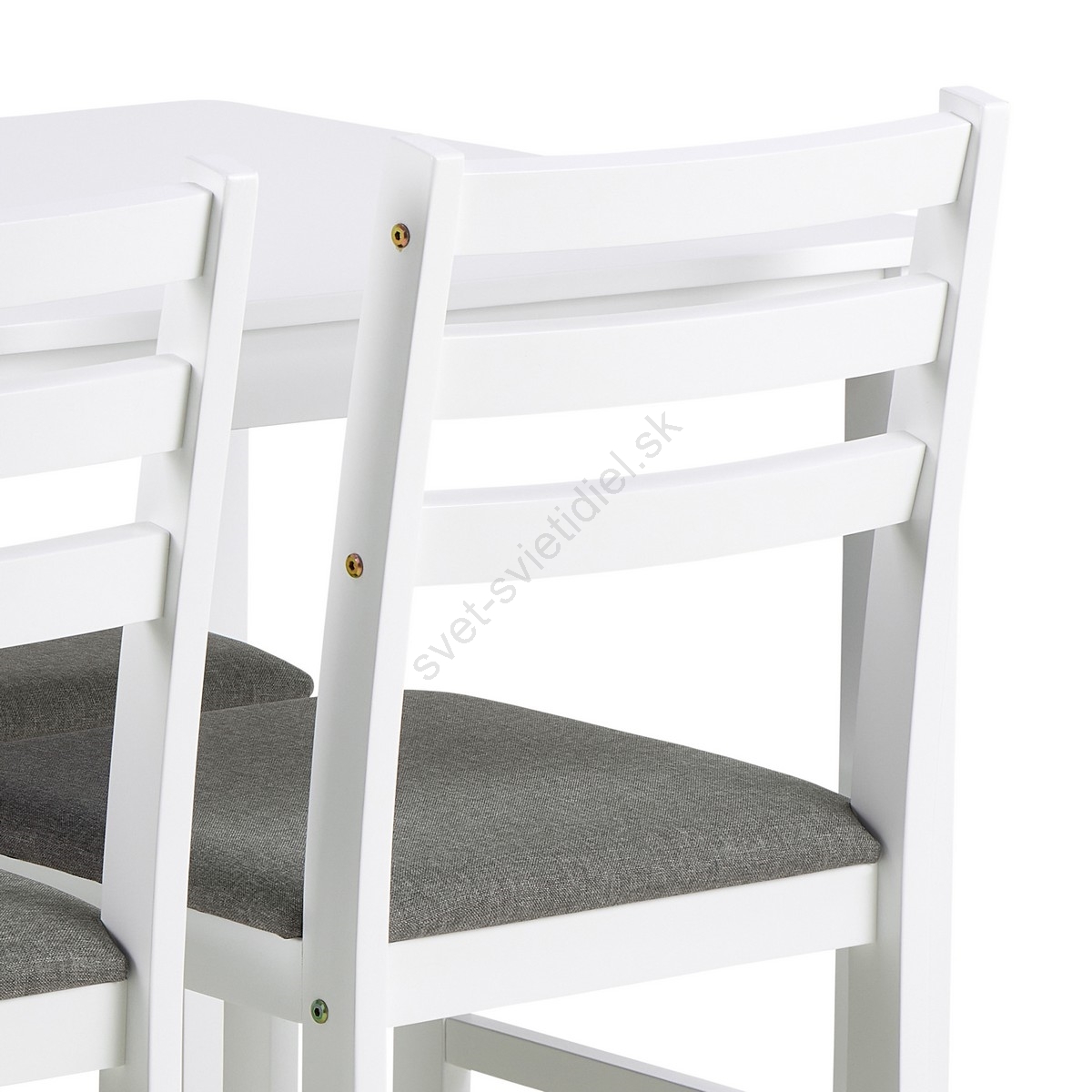 • Stoličky: poťahová látka Sawana svetlosivá, konštrukcia a podstava z kaučukovníka, lakované bielo AC.
