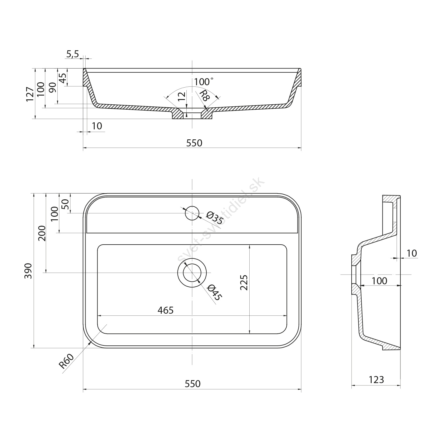 • Má rozmery 550x390 mm a výšku 123 mm.