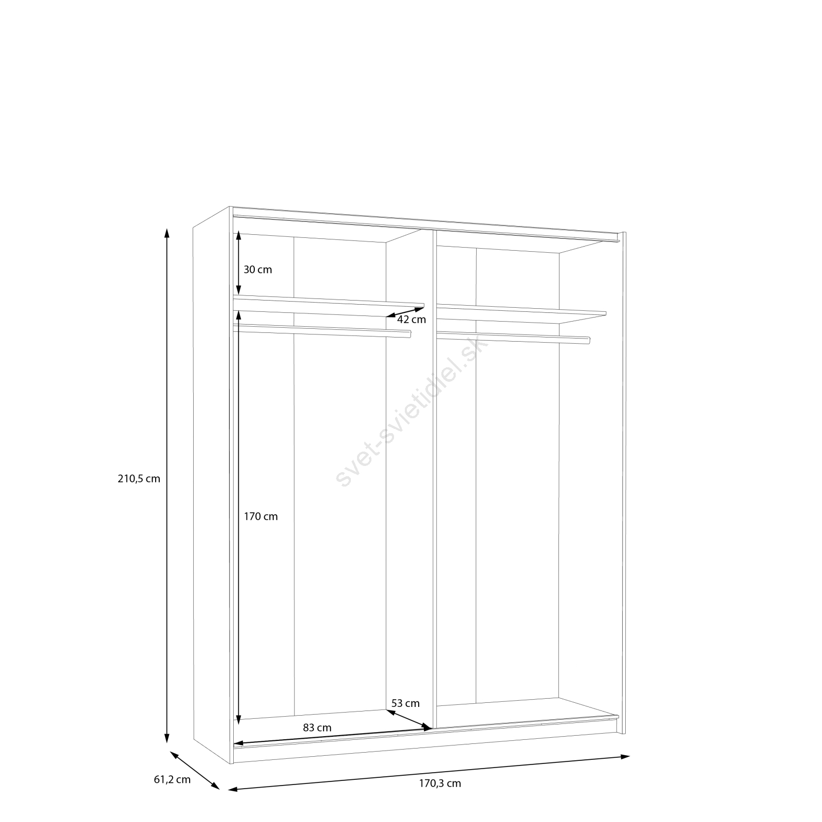 • Skriňa disponuje vešiakovými tyčami, policami a veľkým úložným priestorom na vaše oblečenie, tašky a sezónne veci.