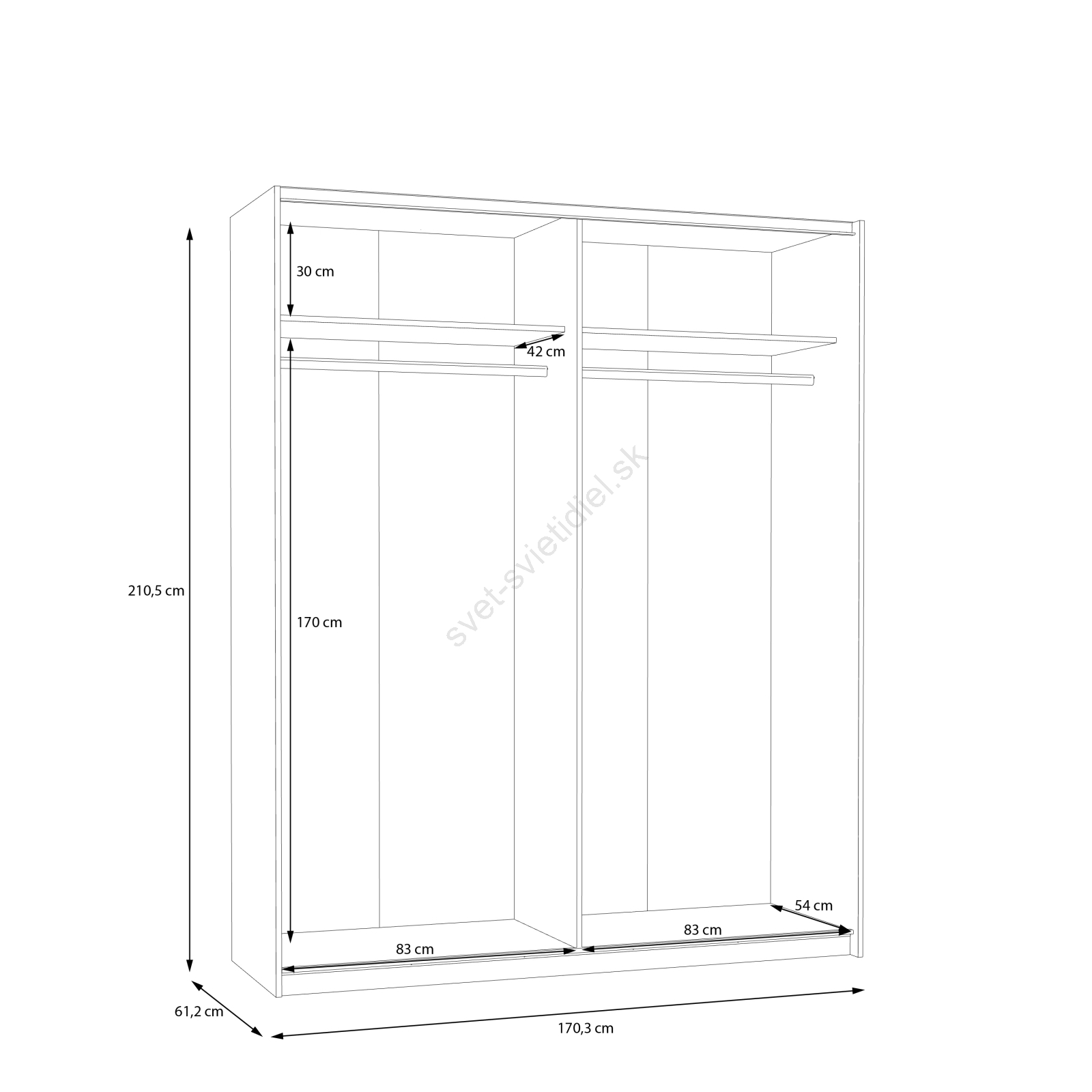 • Skriňa disponuje vešiakovými tyčami, policami a veľkým úložným priestorom na vaše oblečenie, tašky a sezónne veci.