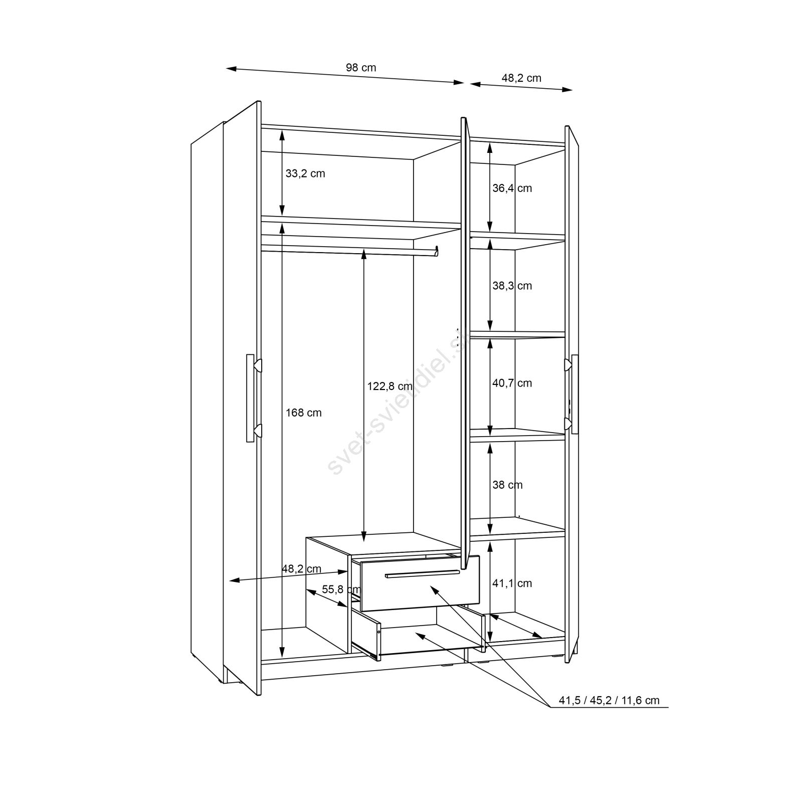 • Skriňa disponuje vešiakovou tyčou, zásuvkami, policami a veľkým úložným priestorom na vaše oblečenie, tašky a sezónne veci.