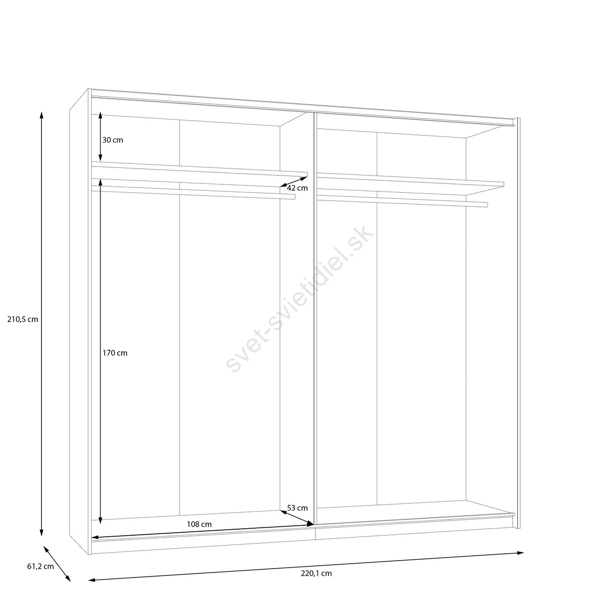 • Skriňa disponuje vešiakovými tyčami, policami a veľkým úložným priestorom na vaše oblečenie, tašky a sezónne veci.