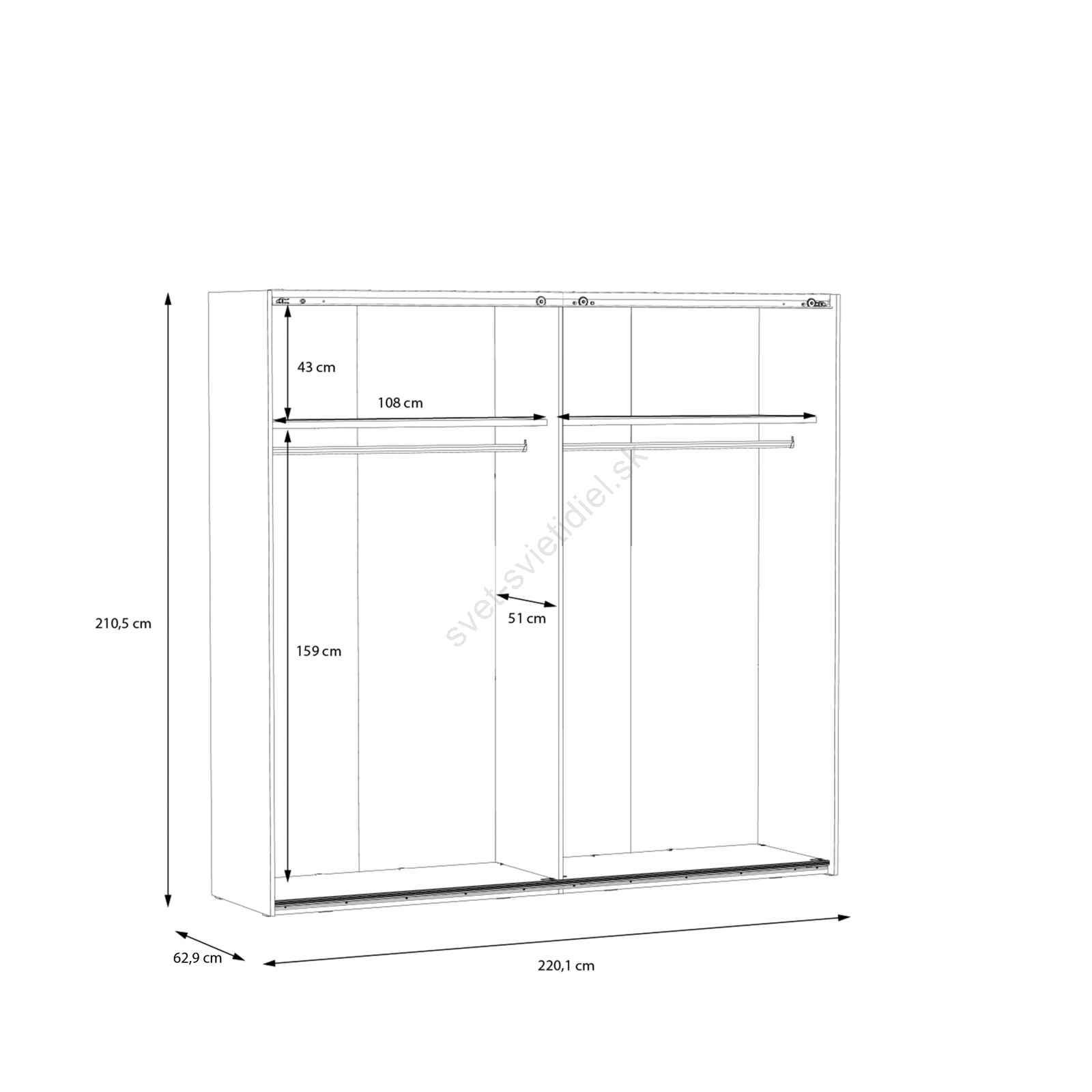 • Skriňa disponuje vešiakovými tyčami, policami a veľkým úložným priestorom na vaše oblečenie, tašky a sezónne veci.