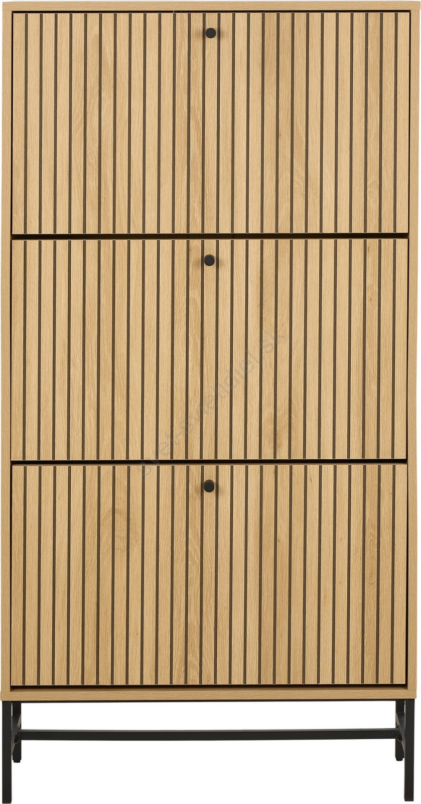 • Tento botník v dubovom vzhľade s lamelovým čelom dodá vašej chodbe štýl a praktickosť.