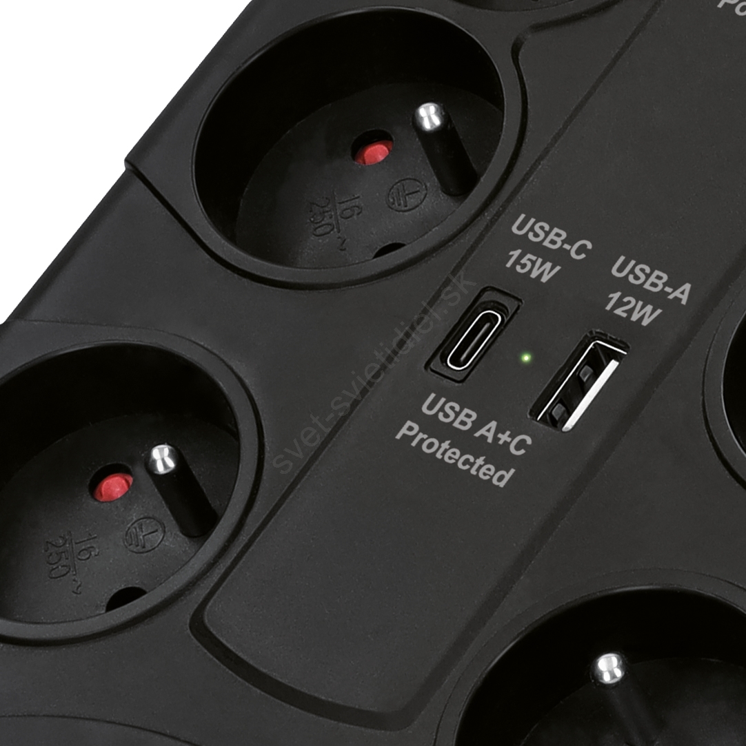 • LED indikácia: Prepätová ochrana aktívna, zásuvky 230V chránené, USB A + C porty chránené.
