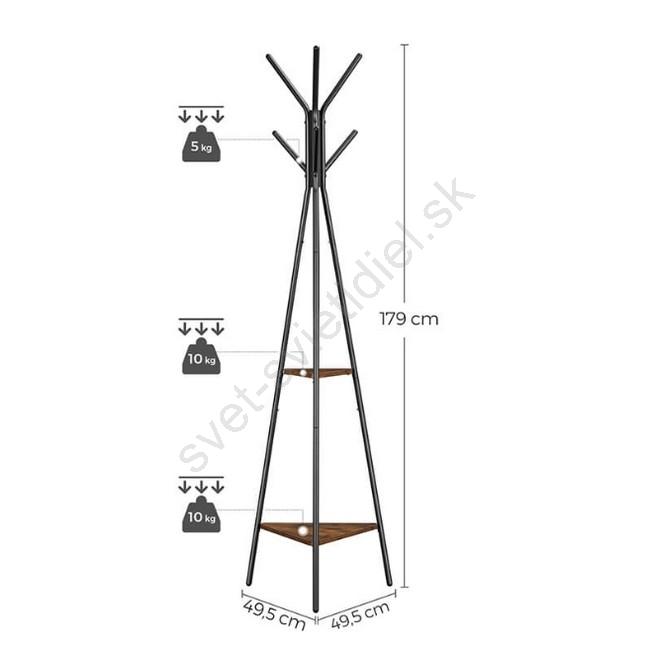 • Vešiak s jednoduchou trojuholníkovou základňou sa pýši 6 elegantnými háčikmi a dvoma robustnými poličkami.