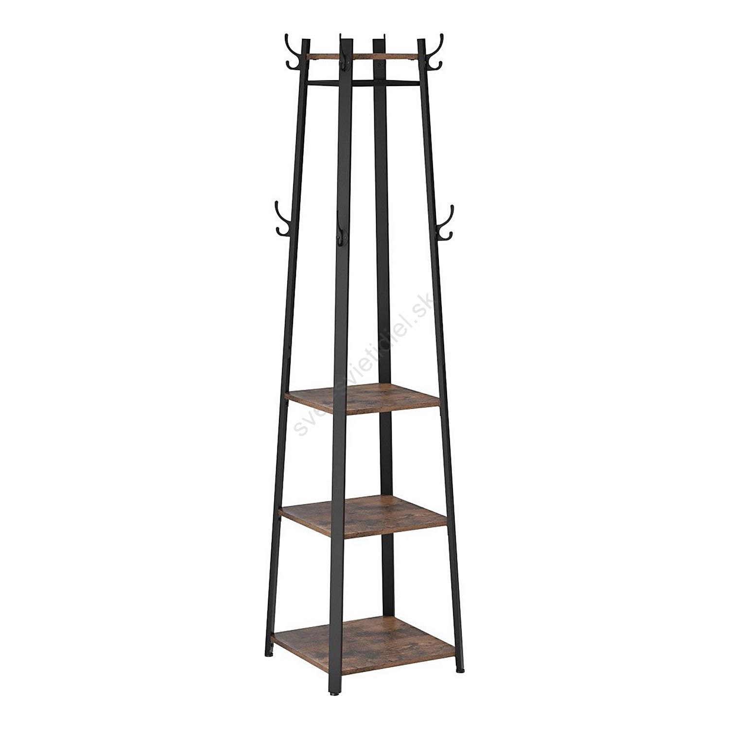 • Vešiak s jednoduchou štvorcovou podstavou sa pýši elegantnými dvojitými háčikmi arobustnými policami.
