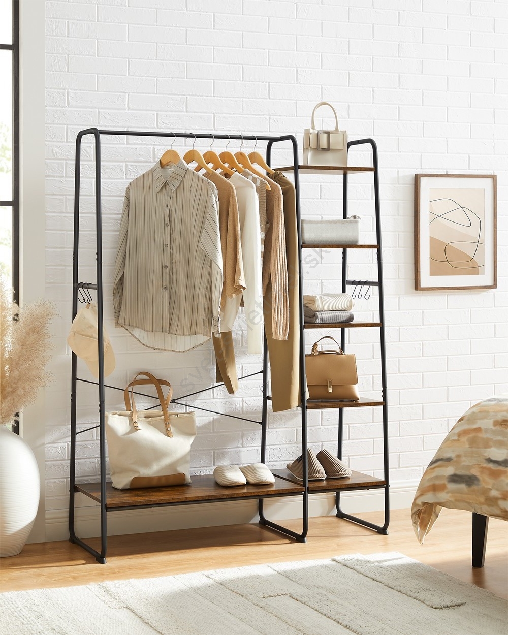 • Zavesíte si bundy, košele a nohavice na hornú tyč po celej dĺžke, na 5 odkladacích políc uložíte tašky, topánky, krabice,  klobúky, šály, dáždniky a ďalšie potrebné veci.