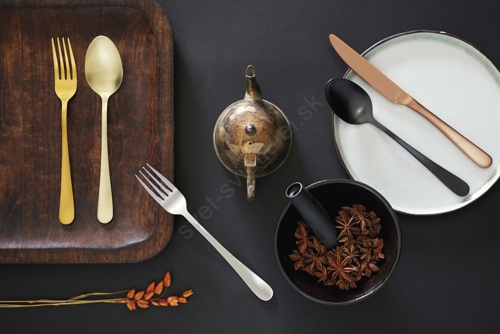 • Sada jedálenského príboru z nehrdzavejúcej ocele v zlatej farbe.