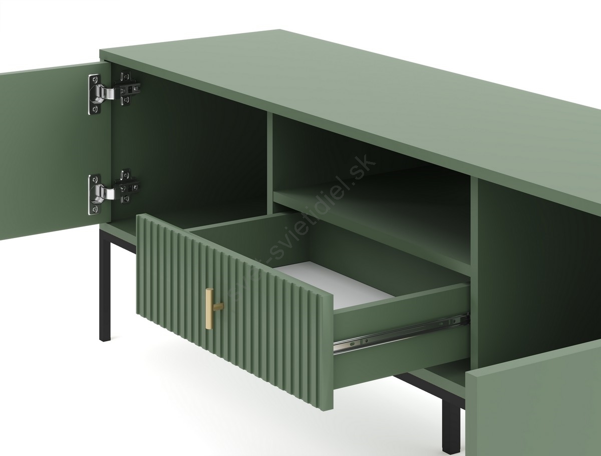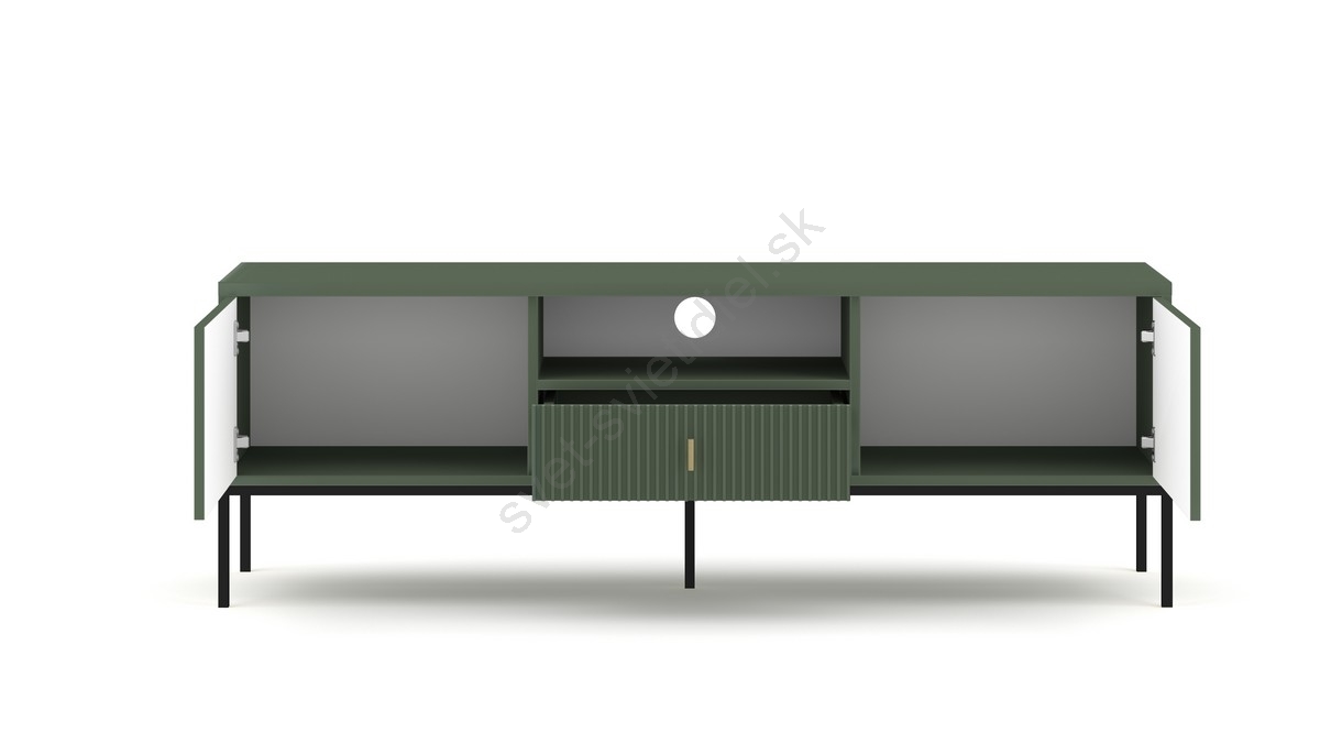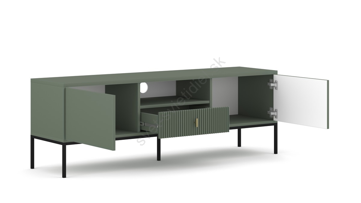 • Má dve uzavreté bočné priehradky, otvorenú poličku s otvorom na káble v strede a zásuvku pod poličkou s rebrovaným povrchom.