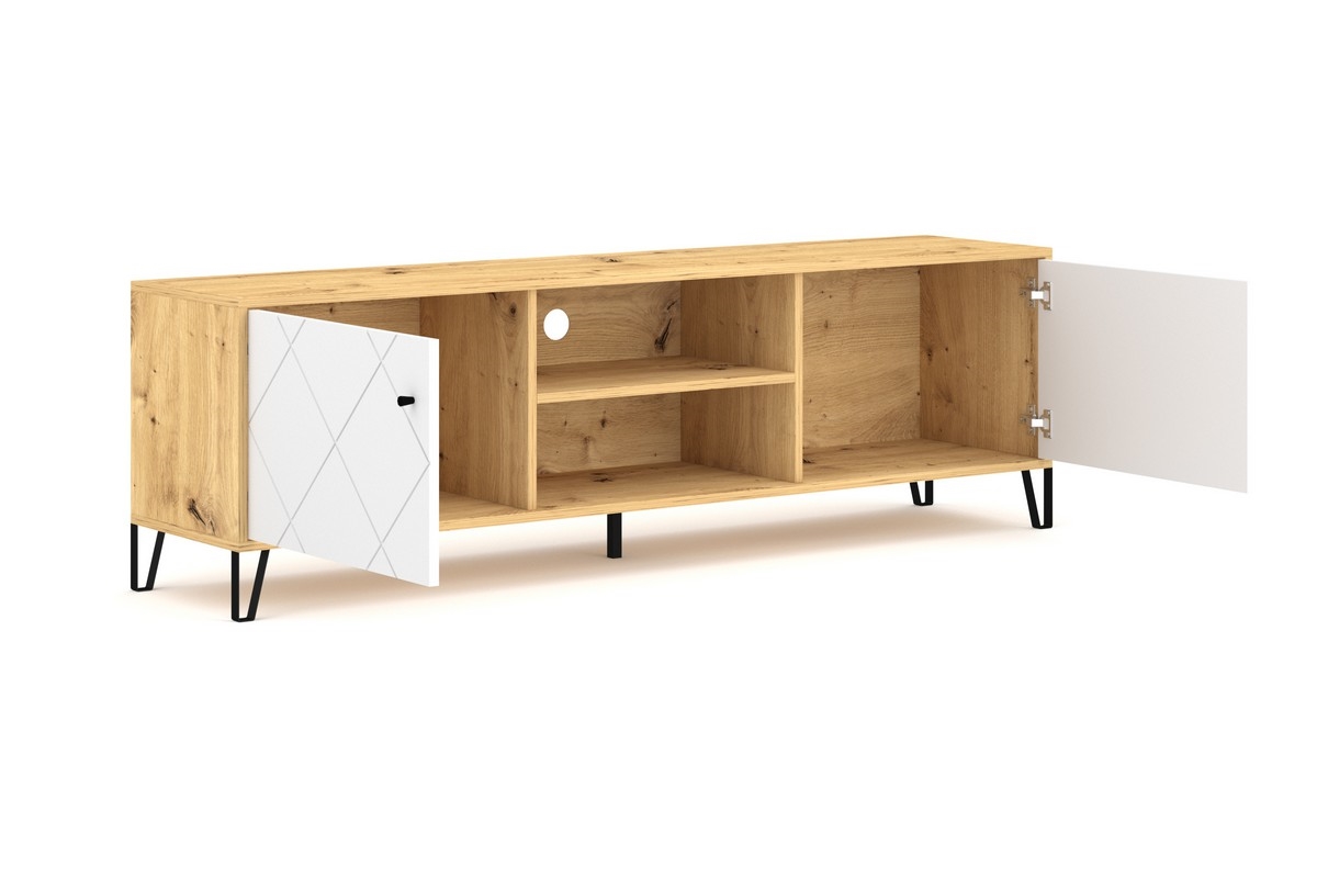 • Má dve uzavreté bočné priehradky, každá s dvierkami s dekoratívnym diagonálnym zdobením, a dve otvorené police s otvorom pre kábel v strede.
