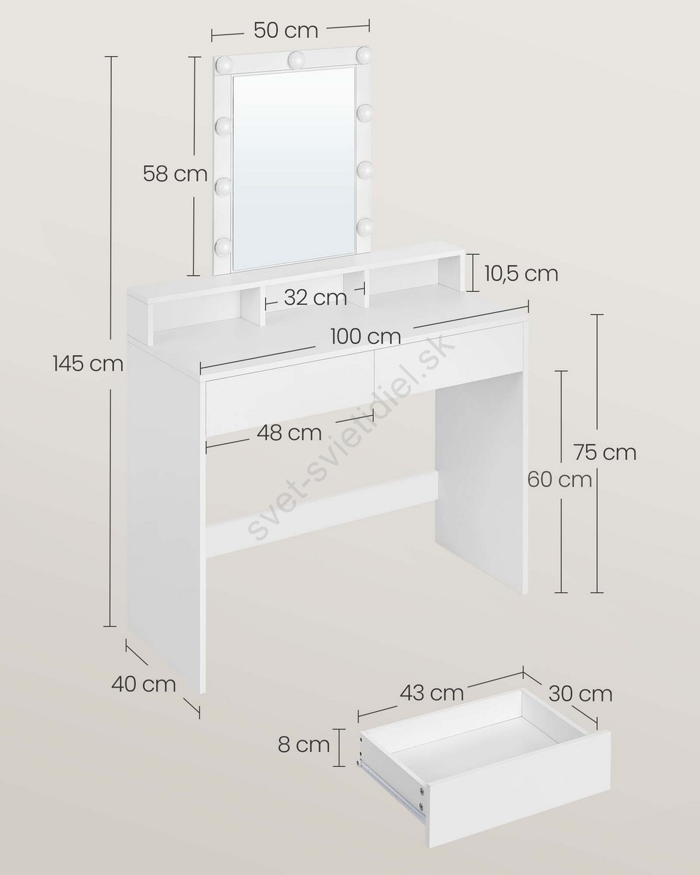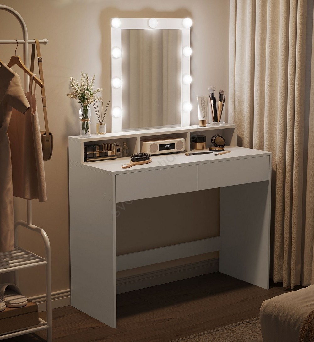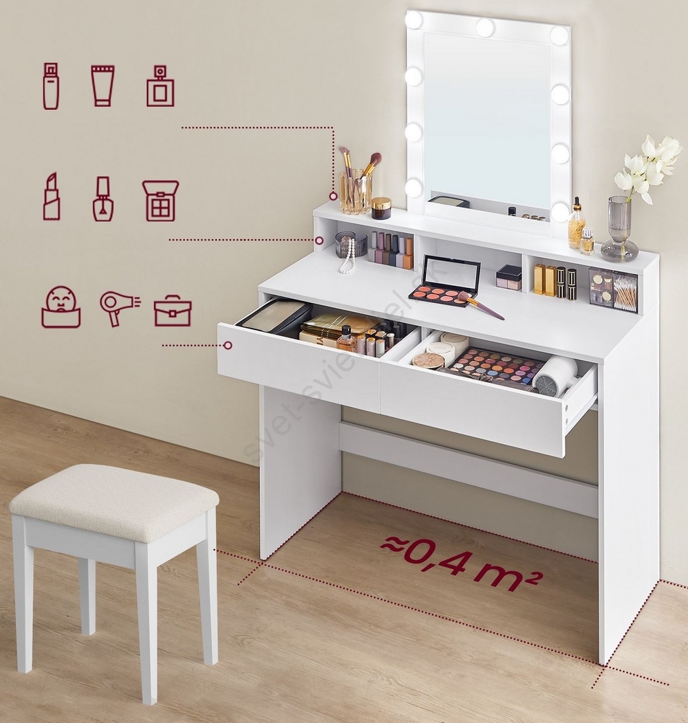 • 2 zásuvky a police udržia vašu kozmetiku a make-up ľahko dostupné.