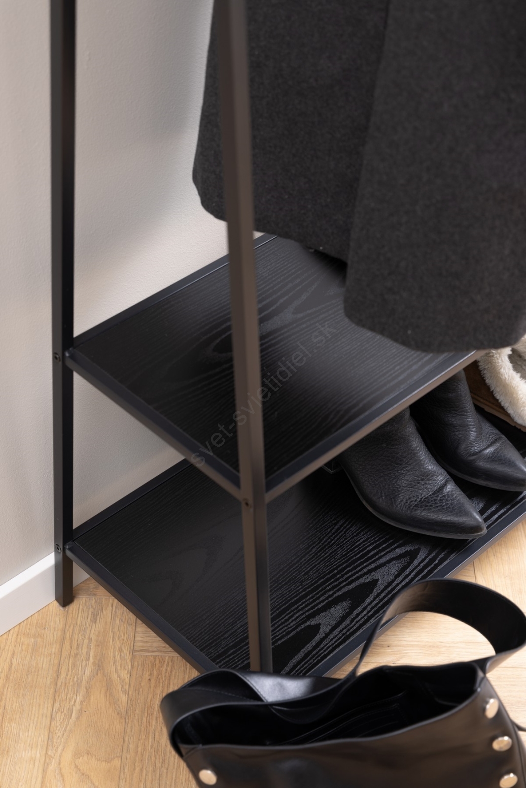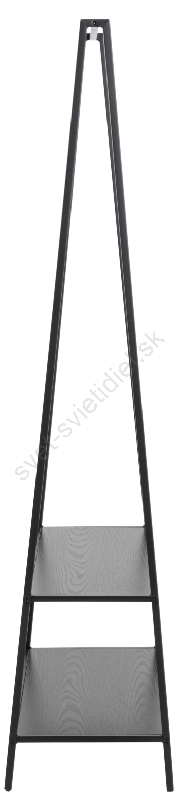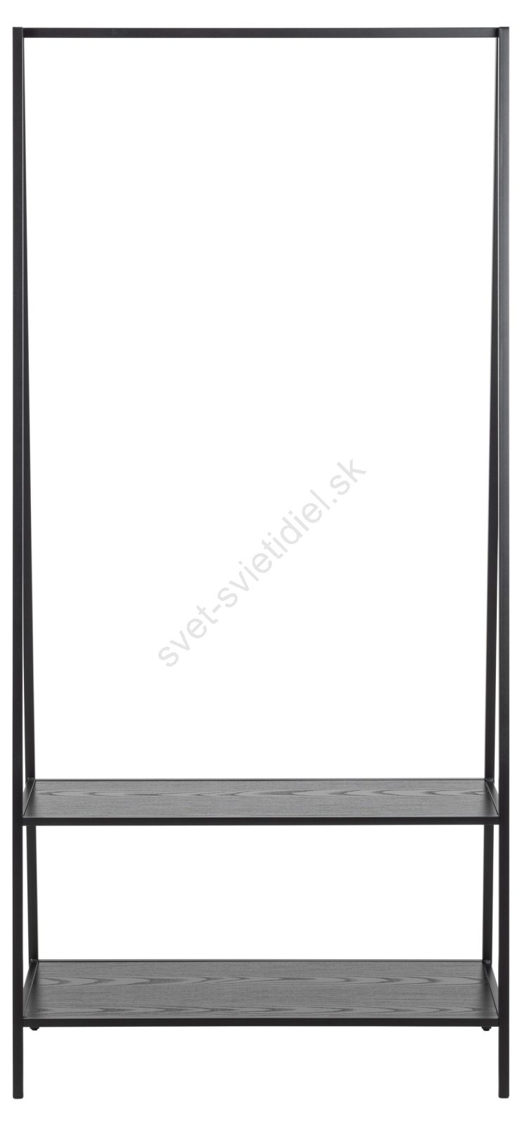 • Rám z matnej čiernej, hrubo práškovo lakovanej ocele, 2 police a základňa z čierneho hrubého melamínu s tyčou na šaty.