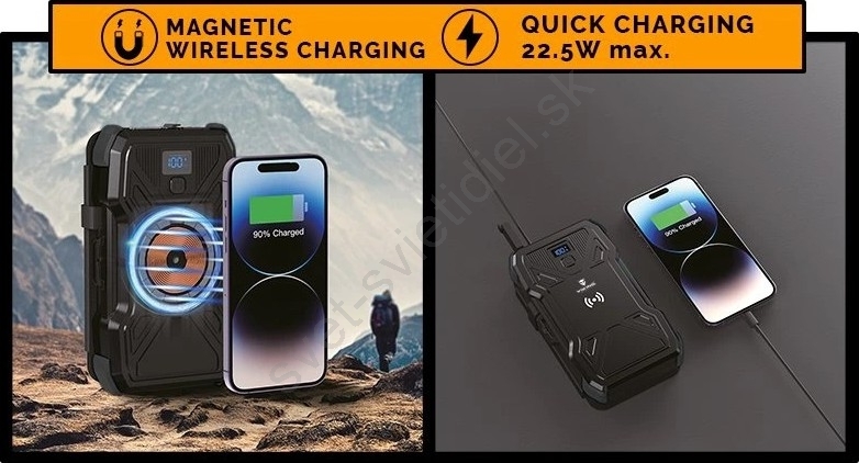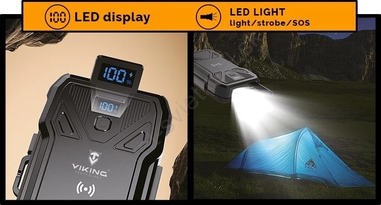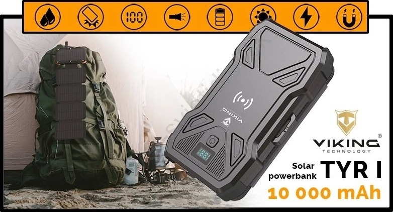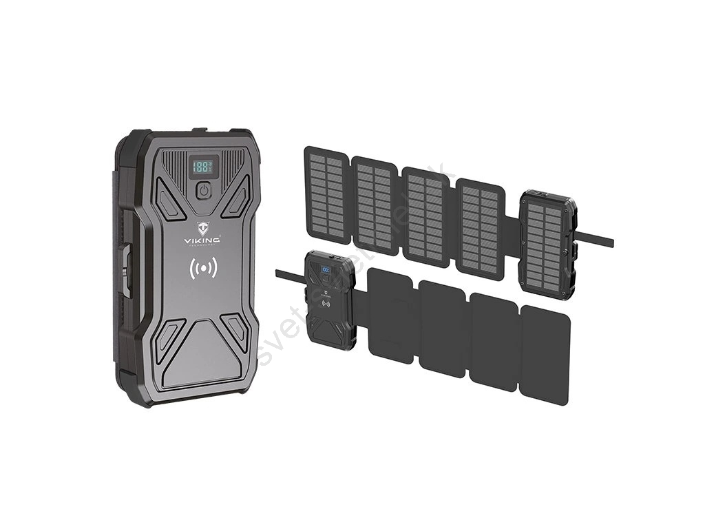 Viking - powerbanka s LED svietidlom, bezdrôtovým nabíjaním a solárnym panelom Power Delivery 22,5 W/10000 mAh