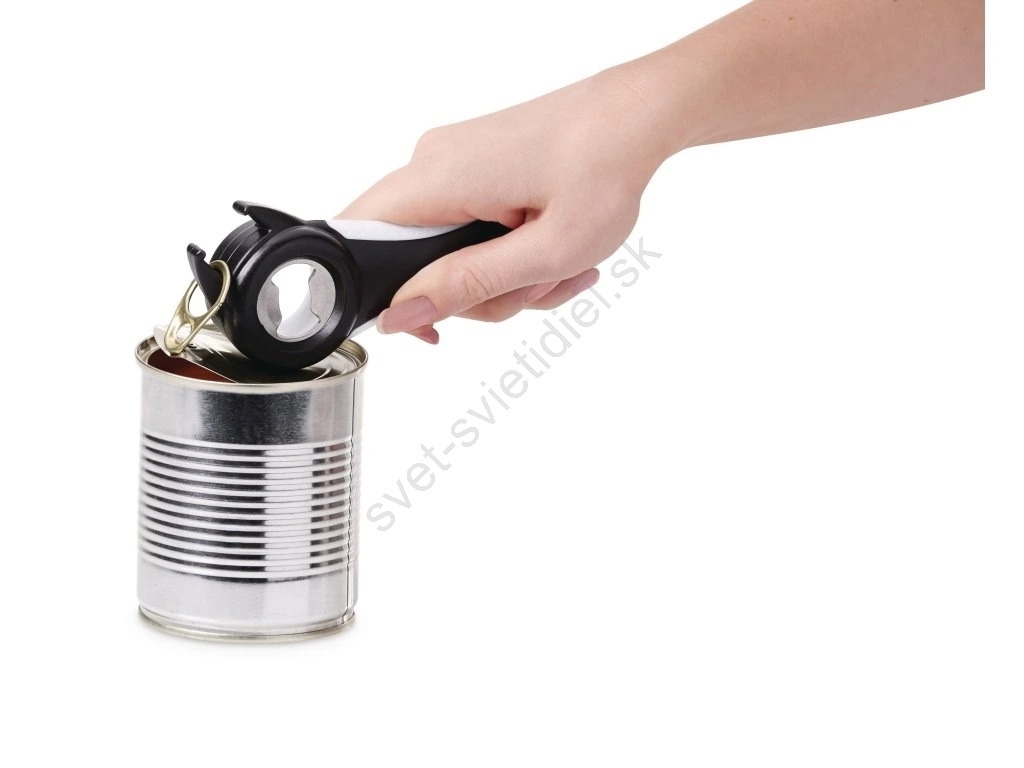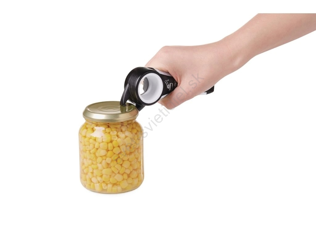 • Vďaka svojmu dizajnu zvládne päť rôznych úkonov: otváranie plechoviek či konzerv, odstraňovanie viečok zaváracích pohárov (kompoty), ako aj bežný korunkový uzáver zo sklenej fľaše a závitový uzáver z PET fľaše.