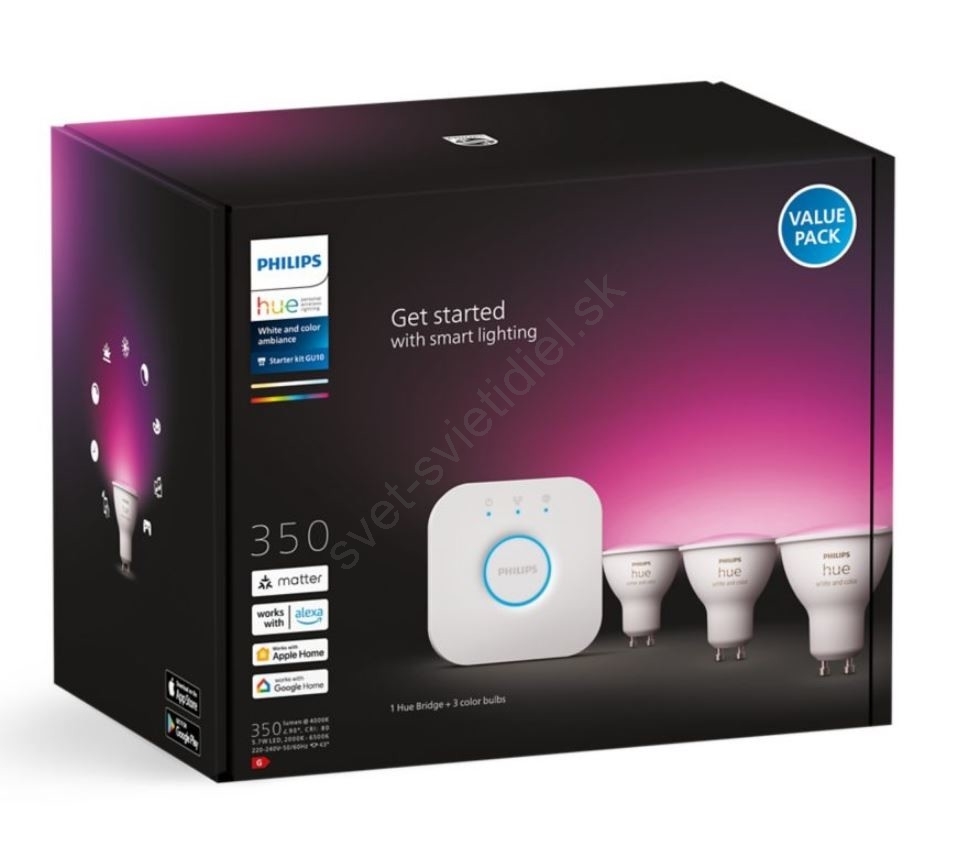 • Sada obsahuje prepojovacie zariadenie Hue Bridge a 3x LED RGB žiarovku Philips Hue White And Color Ambience s paticou GU10.