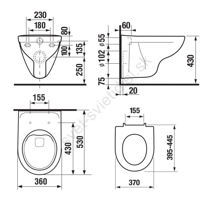• Závesná toaleta s hlbokým splachovaním bez oplachového kruhu.